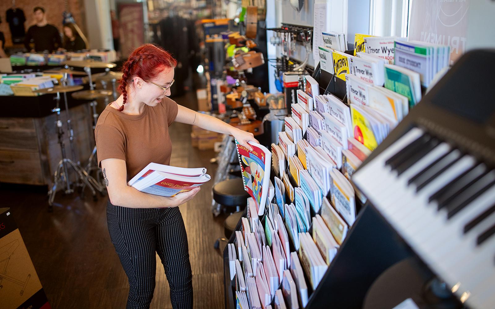 Hustling past a rack of ukuleles and a row of cymbals, Holland Goddard '25 restocks music books at Brick & Mortar Music in downtown Potsdam. As customers enter the store, walking past a beautifully exposed brick wall featuring a mix of acoustic and electric guitars, she greets them with a smile, answers questions, and restrings instruments at the beloved local music shop.
