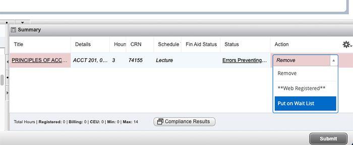 When you try to register for a course that is full, you will receive an error message that says the course is full. You will click the dropdown to add yourself to the waitlist.