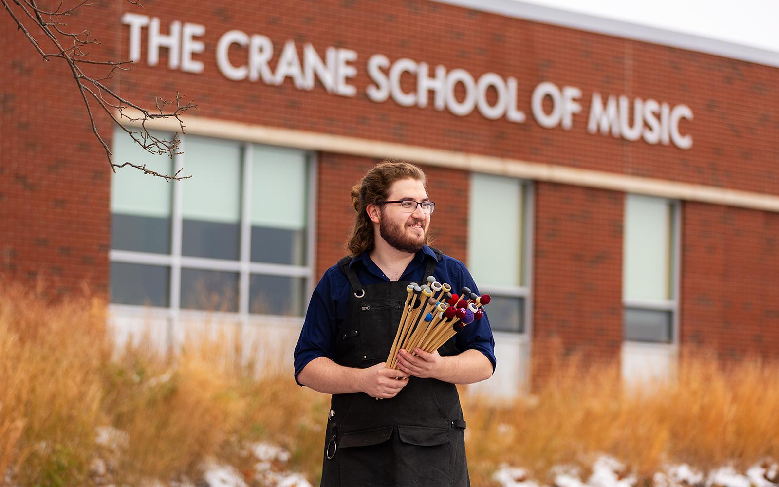 As he rapidly winds yarn tightly around the end of a marimba mallet core, Brandon Phelps ’26 is building far more than a set of percussion tools—he’s creating access, sustainability and opportunity for young musicians. A music education major at The Crane School of Music, Phelps has spent the last two years refining the art of hand-making marimba mallets while developing a comprehensive “cookbook” to help elementary and high school music programs build their own.