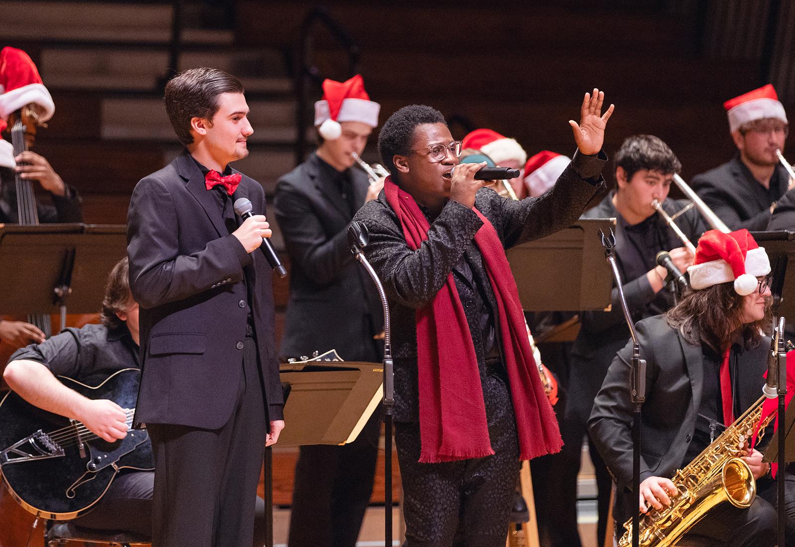 Manny Coleman (right) and Cade Lamphere Jr. (left) perform the Frank Sinatra versions of "Santa Claus is Coming to Town" and "Let It Snow! Let It Snow! Let It Snow!" alongside the Crane Jazz Ensemble as part of the 2025 Crane Candlelight Concert. The audio from the concert will be broadcast on North Country Public Radio as part of the station's holiday programming again this year.
