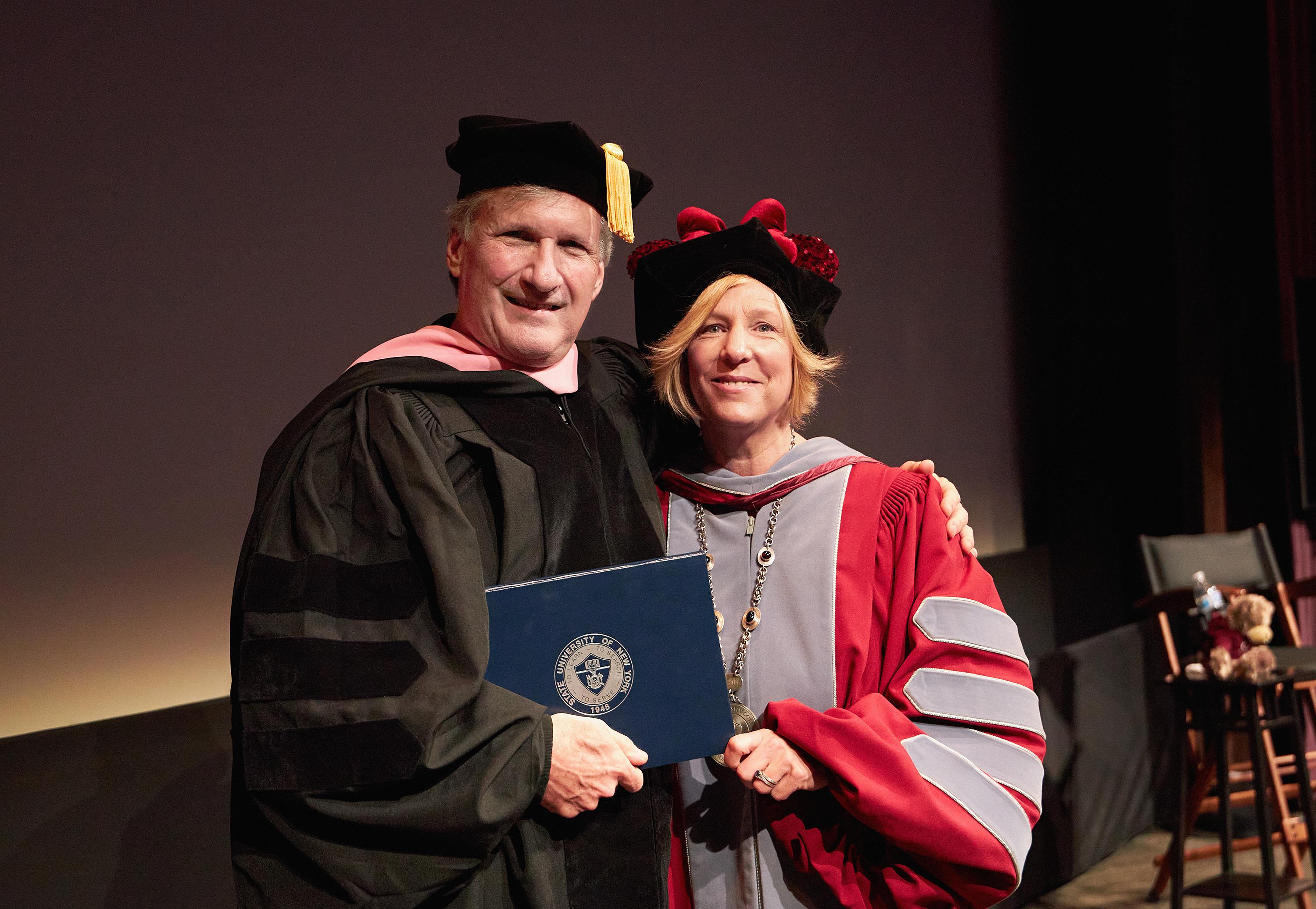 “By the end of the song, we were both up dancing and singing. It was one of the most joyous moments I’ve ever had in my life. But it wasn’t joyous just for me. It was for you, too—because you have the gift of loving what you do, and that is very special,” Smith said. “As president of SUNY Potsdam, I am honored that your story began at The Crane School of Music, where you discovered that sound can be both a musical and a technical art, and that doing something you love every day is a possibility. As a professional and as a person, you embody the principles that guide the State University of New York: to learn, to search and to serve.”