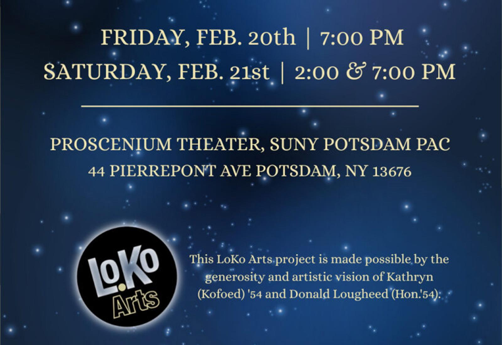 SUNY Potsdam will host the LoKo Arts musical theatre showcase, “A New World,” on Feb. 20 and 21 in the Performing Arts Center.