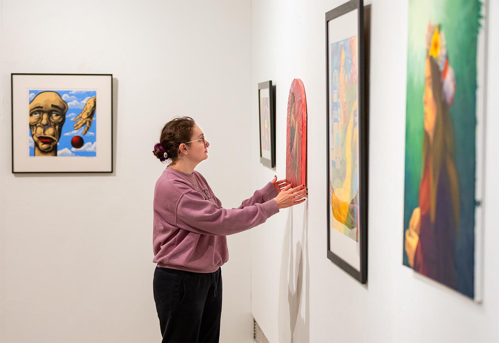 Katelin Babbitt ’26, an anthropology major with an art history minor, adjusts a painting in the Gibson Gallery in preparation for the “Art Attack” show and Bachelor of Fine Arts exhibition.