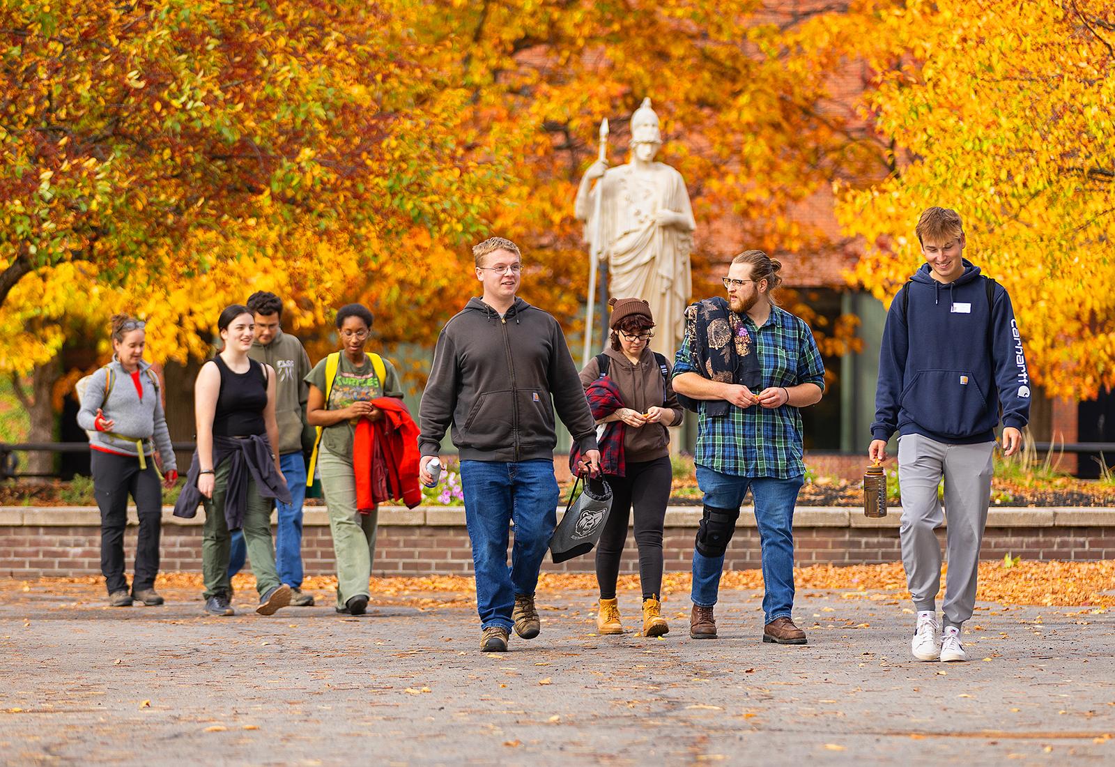SUNY Potsdam Student Ambassador Luke Tytler (far right) leads a campus tour for visiting students and faculty from Finger Lakes Community College on Tuesday, Oct. 21. Participants included, from right to left, John DeRue, Cajsa Young, Mason Bush, Brechante Bolivian, Dan Skelton, Morgan Paro, and Maura Sullivan. The visit marked a new articulation agreement between the two colleges, creating a streamlined transfer pathway for students pursuing environmental science careers.