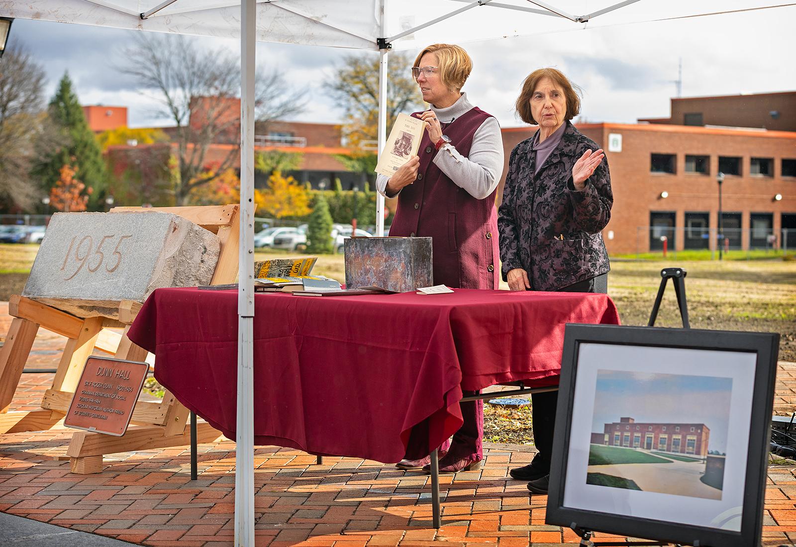 College Archivist Emerita Jane Subramanian ’72 (right) addresses the crowd while opening a time capsule alongside SUNY Potsdam President Dr. Suzanne R. Smith. Smith is holding up an original copy of a Christmas cantata by Ralph Vaughan Williams, “This Day,” which was premiered by the Crane Chorus and Orchestra in 1955.
